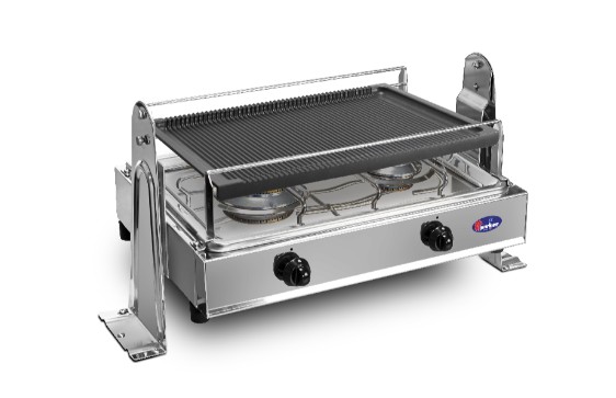 Navtični štedilnik iz nerjavečega jekla, model FO200NA. Štedilnik iz nerjavečega jekla 18/10, delujoč na plin, z varnostnim ventilom, pritrjen na gibalih, s pritrdilom za lonec.