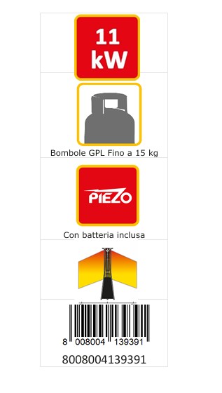11 Kw LPG zunanji grelec Učinek živega plamena, piezoelektrični vžig Nastavljiv plamen Nerjaveča in barvana jeklena konstrukcija Notranji prostor za jeklenke do 15 kg Idealno za bare, restavracije, gostinstvo, terase